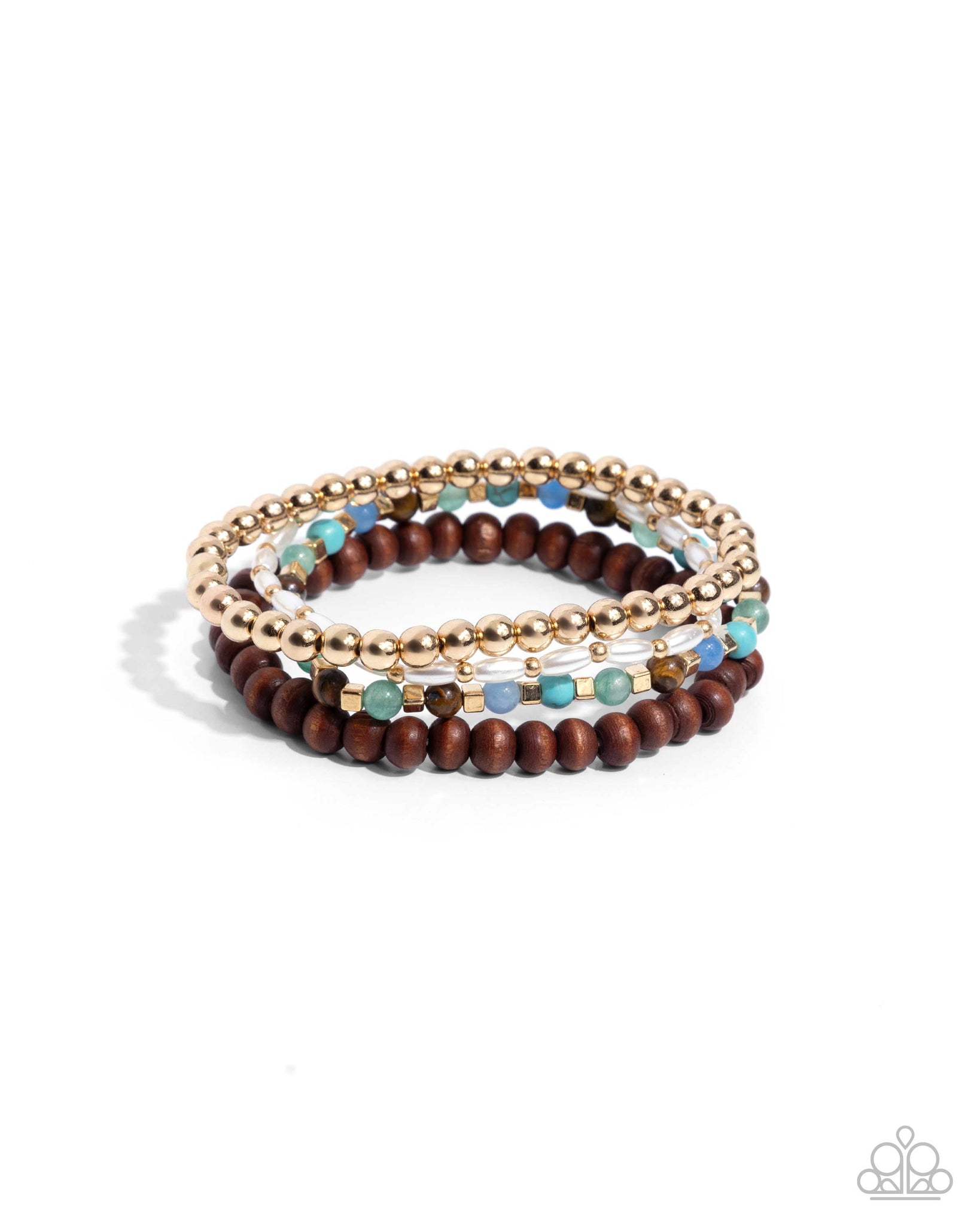 Infused along elastic stretchy bands, a collection of glistening gold beads, brown wooden beads, gold cube beads, cylindrical white pearls, dainty gold studs, and jade, lapis, turquoise, and tiger's eye stone beads coalesce and stack along the wrist for an eclectic pop of color and flair. As the stone elements in this piece are natural, some color variation is normal.
