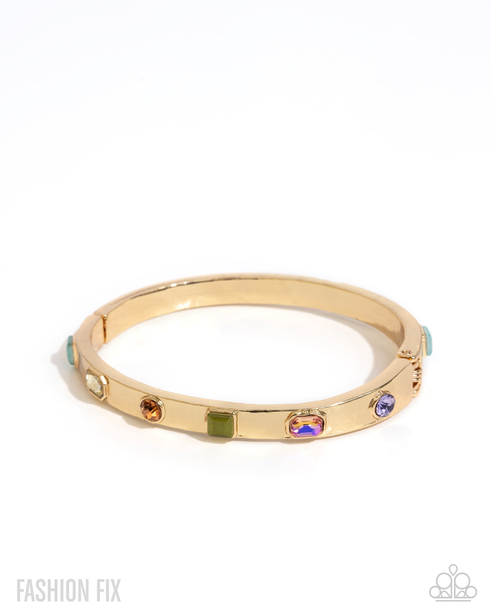Varying in size, opacity, and cut, an array of multicolored gems, rhinestones, and cat's eye stones are encrusted along the center of a thick gold band, creating a classic, chic centerpiece. Features a hinged closure.