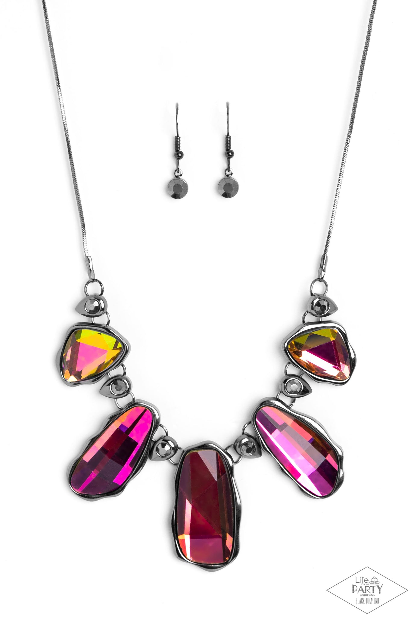 Featuring a UV shimmer, a glittery collection of raw cut iridescent gems delicately link with dainty hematite rhinestone dotted gunmetal teardrops below the collar, creating a stellar fringe. Features an adjustable clasp closure.